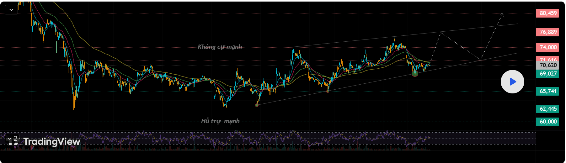 Tuần trước BTC có nhịp tăng khá tốt lên khỏi vùng 74k nhưng sau đó bị từ chối tại kháng cự trên của kênh giá. Xuất hiện lực bán mạnh tại vùng 76k. Giá điều chỉnh về vùng 70k. Cá mập có dấu hiệu quét thanh khoản đáy nhẹ trước khi giữ giá. Đây là hành vi rất quen thuộc: