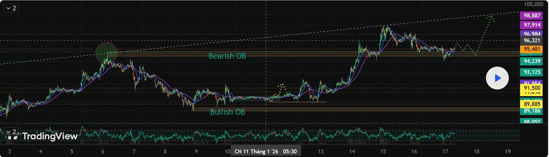 • Giá hiện nằm trên vùng Bearish OB 95,200.