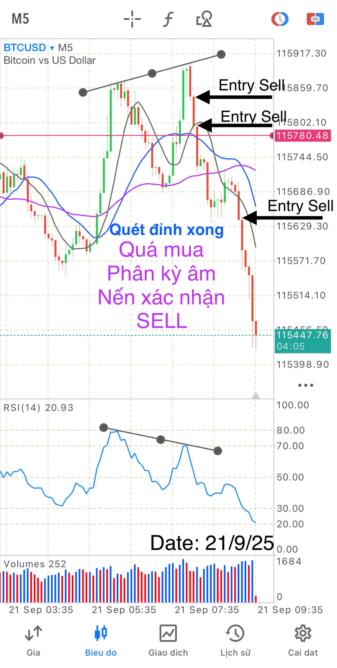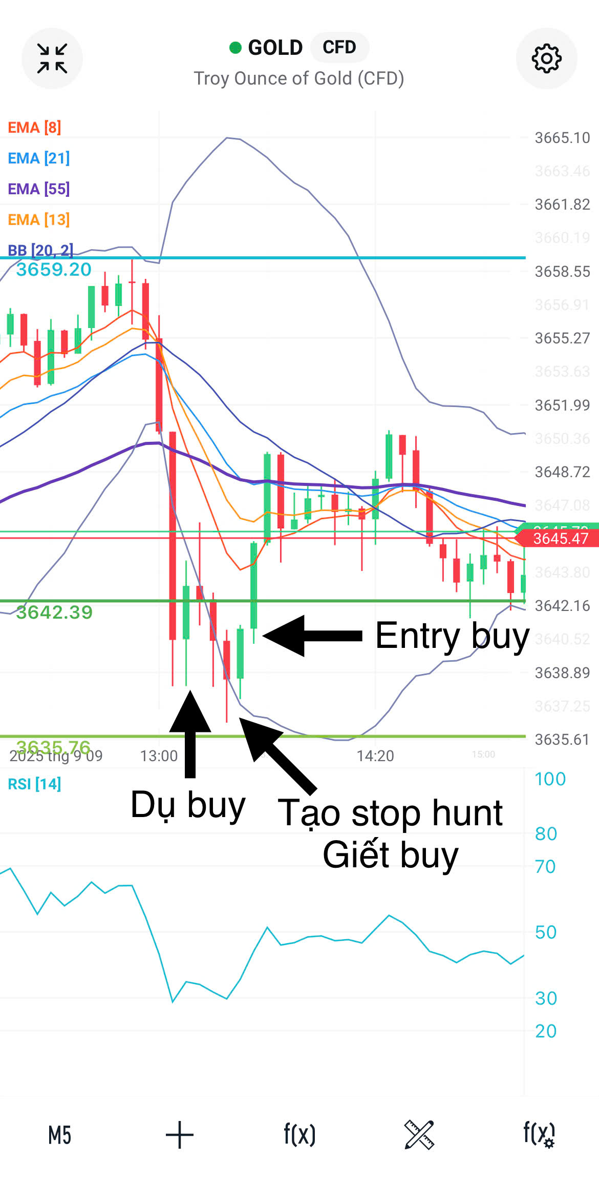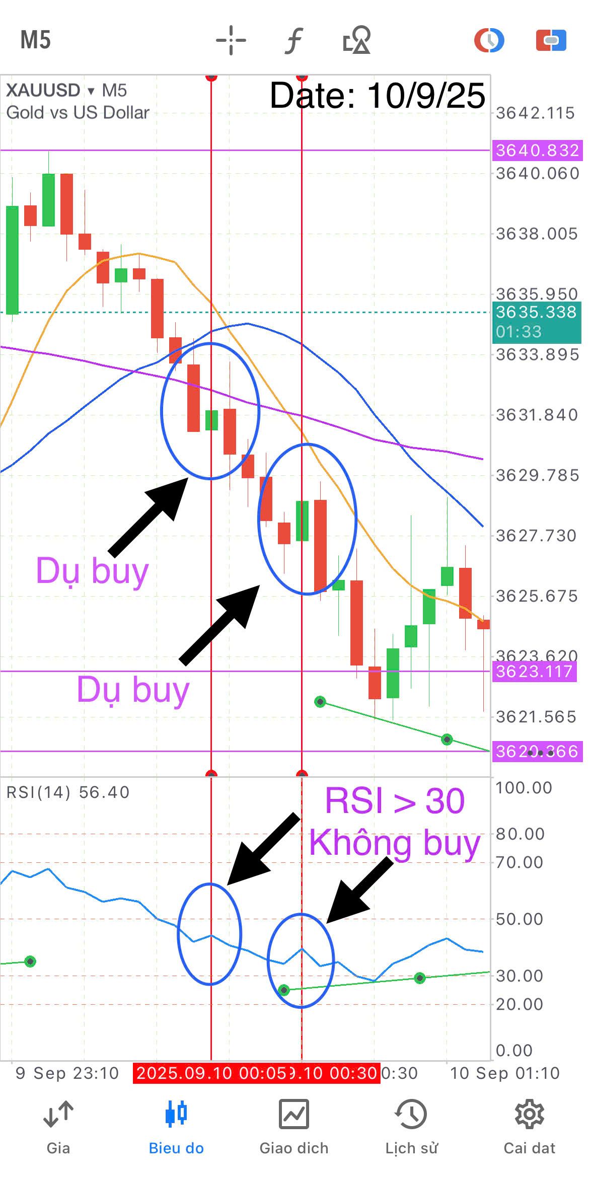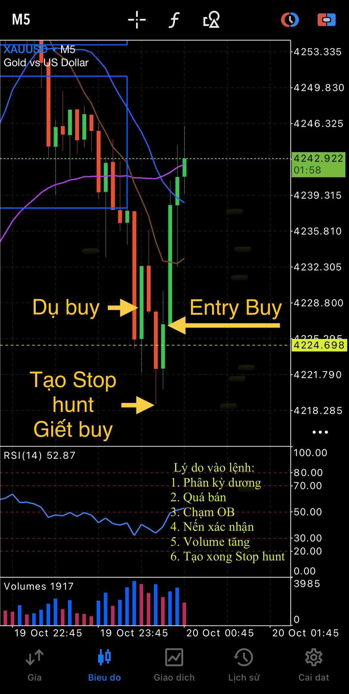 Khi giá về vùng quá bán hoặc quá mua trên khung M5, nếu xuất hiện phân kỳ kèm stop hunt xong, có M5 đóng xác nhận thì vào lệnh tốt.