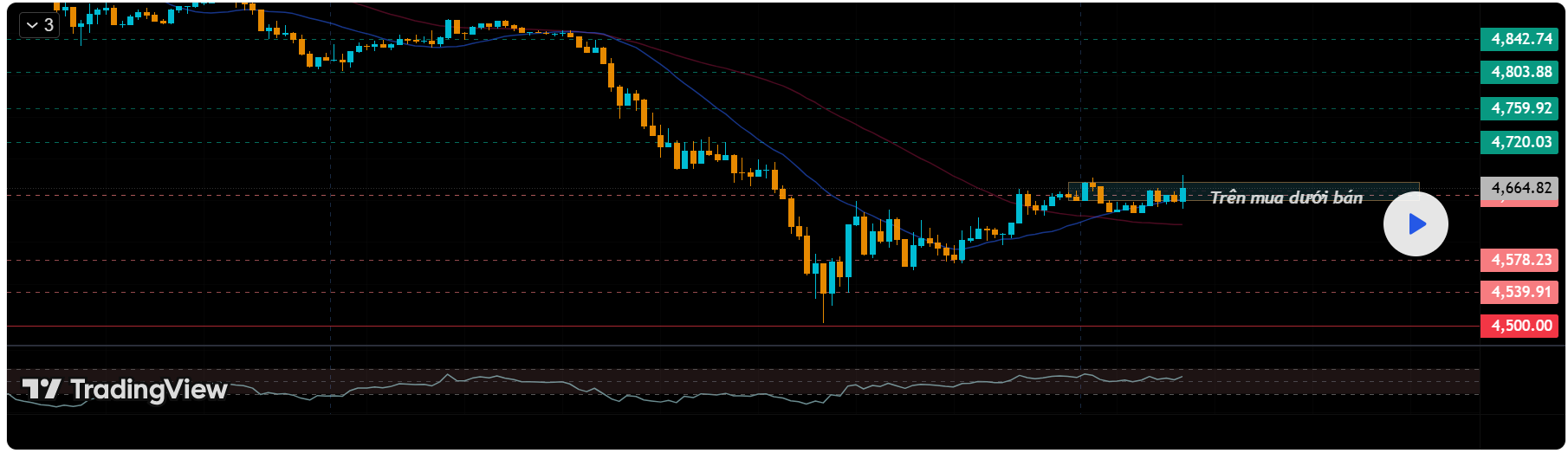- Giá chạm kháng cự 4670 – 4720 – 4760 (bật lại kèm nến M5 xác nhận)