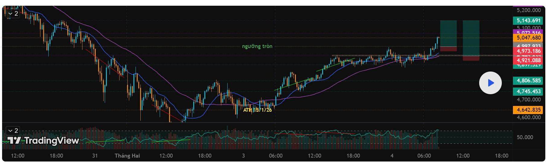 Cấu trúc giá: Tạo higher high – higher low liên tục. Vùng 5.000 là ngưỡng tâm lý tròn, đã bị test nhiều lần, khả năng phá tiếp cao. RSI > 60, chưa vào quá mua, tăng còn dư địa, nhưng dễ có rung lắc ngắn.