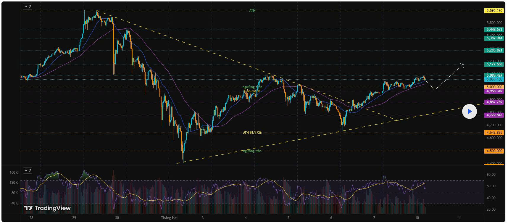 - Giá chạm hỗ trợ 5000 - 4963 - 4882 (bật lại kèm nến M5 xác nhận)