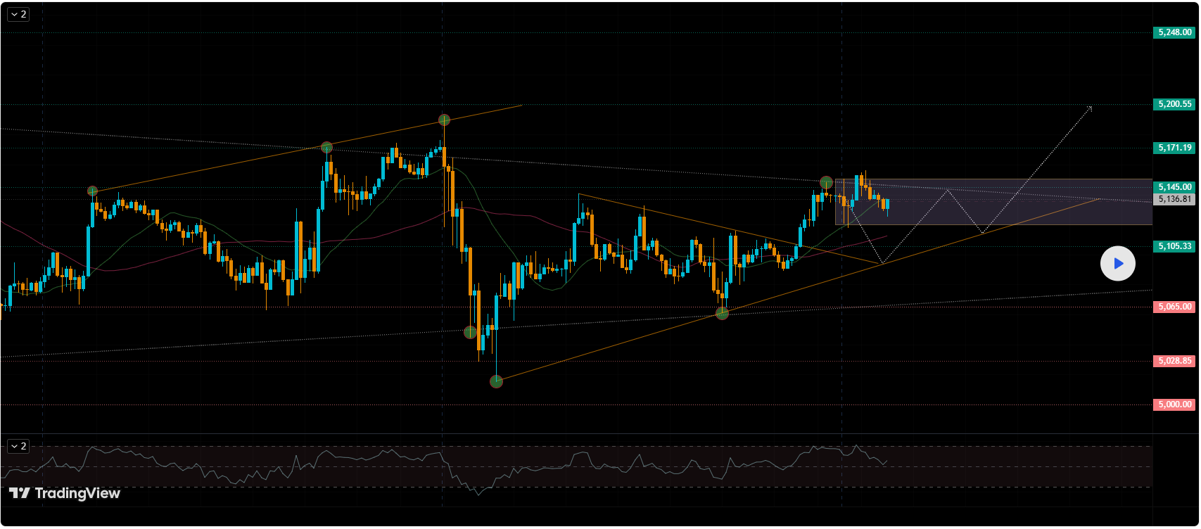 Trên khung M15: Giá đang di chuyển trong kênh tăng ngắn hạn. Sau khi phá trendline giảm trước đó, thị trường đang retest lại vùng hỗ trợ. Vùng 5135 – 5145 hiện là vùng tích lũy. Nếu phá trendline trên, vàng có khả năng vượt vùng 5170 để mở rộng đà tăng. Hiện tại giá được nâng đỡ bởi MA20 nhưng MA20 đang cách xa MA50. RSI đang dốc xuống cho thấy khả năng điều chỉnh về trendline dưới trước khi tăng lại.