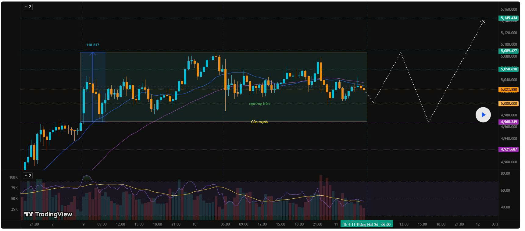 - Giá chạm hỗ trợ 5000 - 4968 - 4921 (bật lại kèm nến M5 xác nhận)