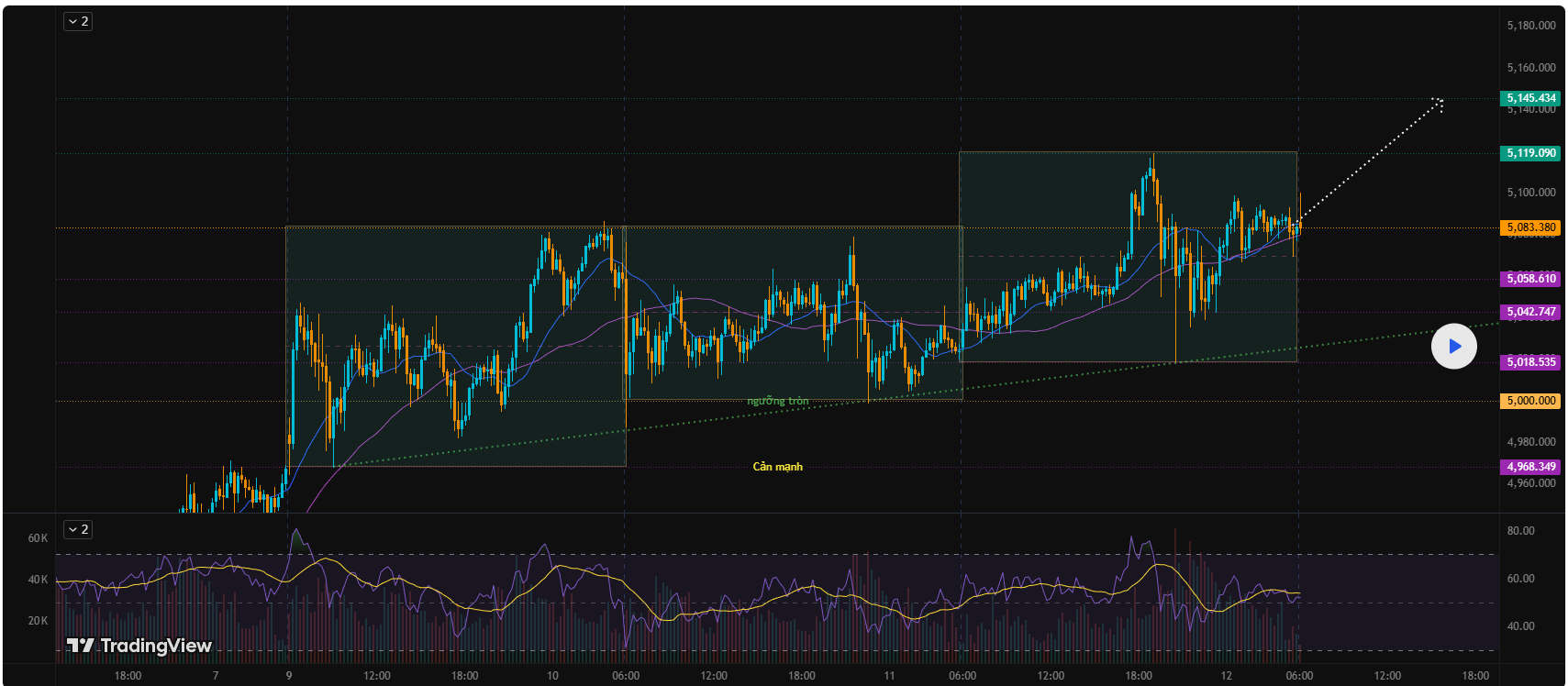 Giá dao động trong biên 5,018 – 5,119. Có nhịp quét thanh khoản xuống gần 5,020 rồi bật mạnh. Cuối phiên Mỹ duy trì trên MA ngắn hạn, lực mua vẫn chiếm ưu thế.