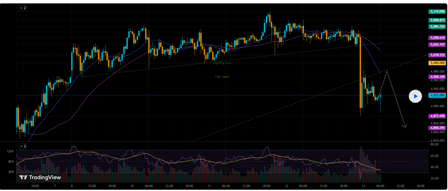 Giá đi ngang tích lũy phía trên 5,070. Sau đó xuất hiện một cây nến giảm mạnh phá cấu trúc, kích hoạt hàng loạt SL. Volume tăng đột biến cho thấy lực bán chủ động. Cuối phiên xuất hiện hồi nhẹ nhưng chưa đủ mạnh để xác nhận đáy.
