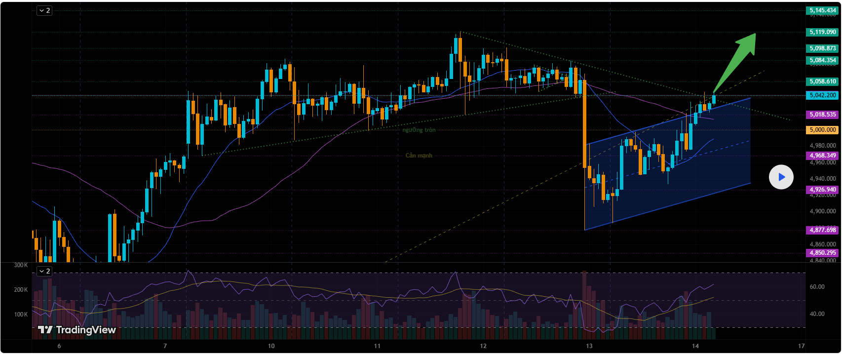 - Giá chạm hỗ trợ 5018 - 5000 - 4968 - 4926 (bật lại kèm nến M5 xác nhận)