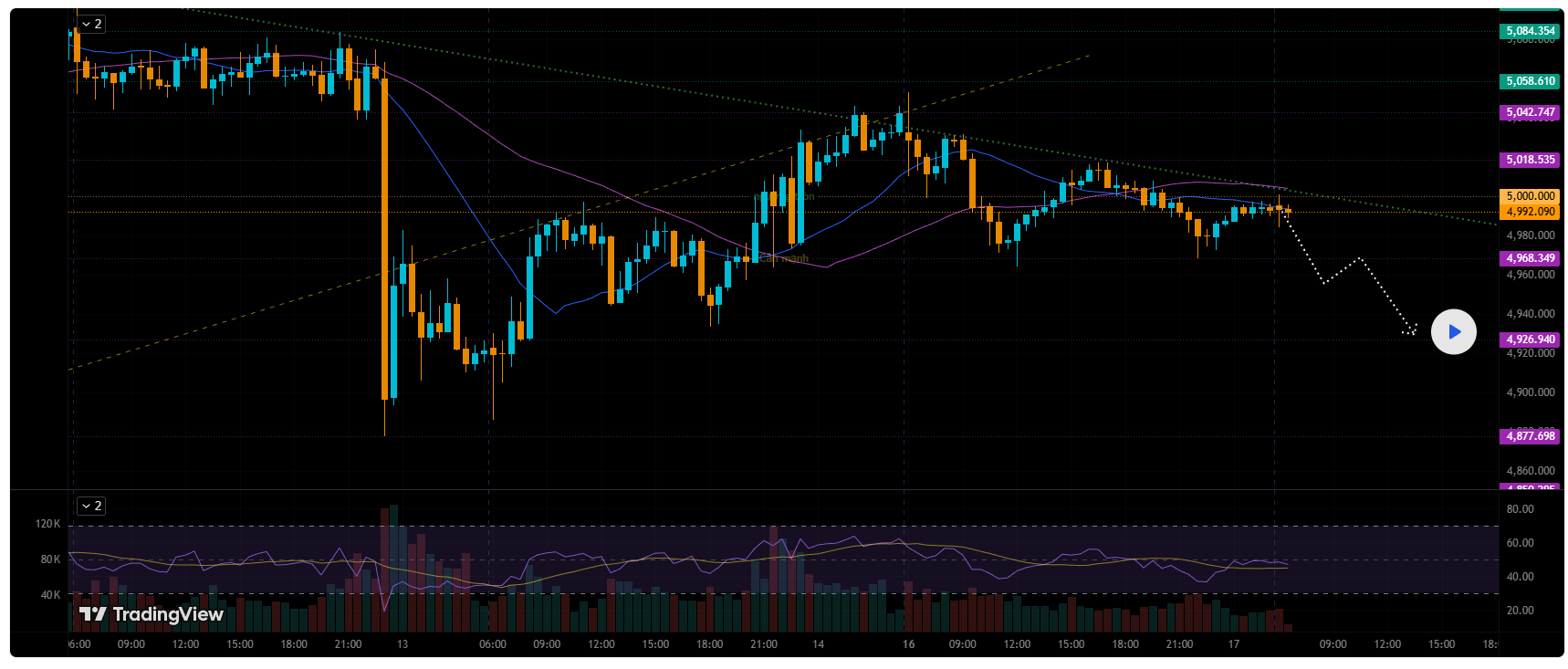 - Giá chạm hỗ trợ 4968 - 4926 - 4877 (bật lại kèm nến M5 xác nhận)