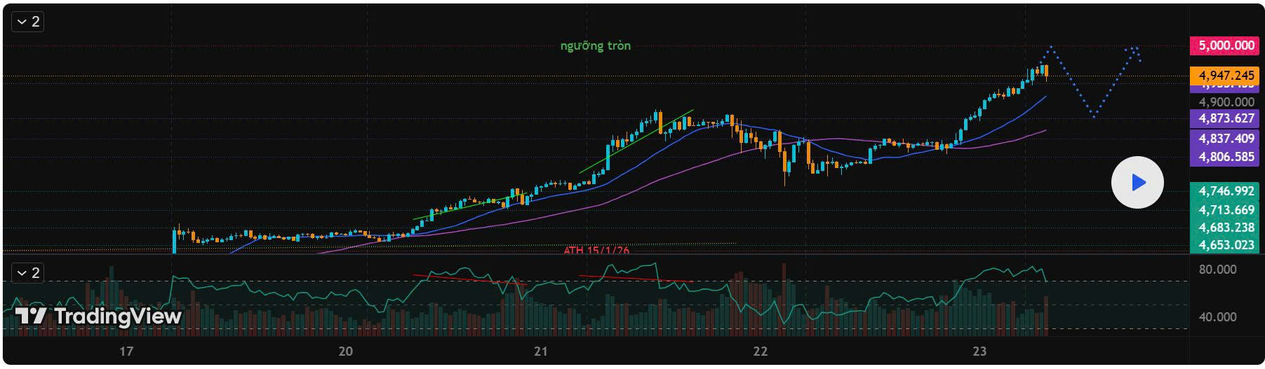 - Giá chạm kháng cự 5000 (bật lại kèm nến M5 xác nhận)