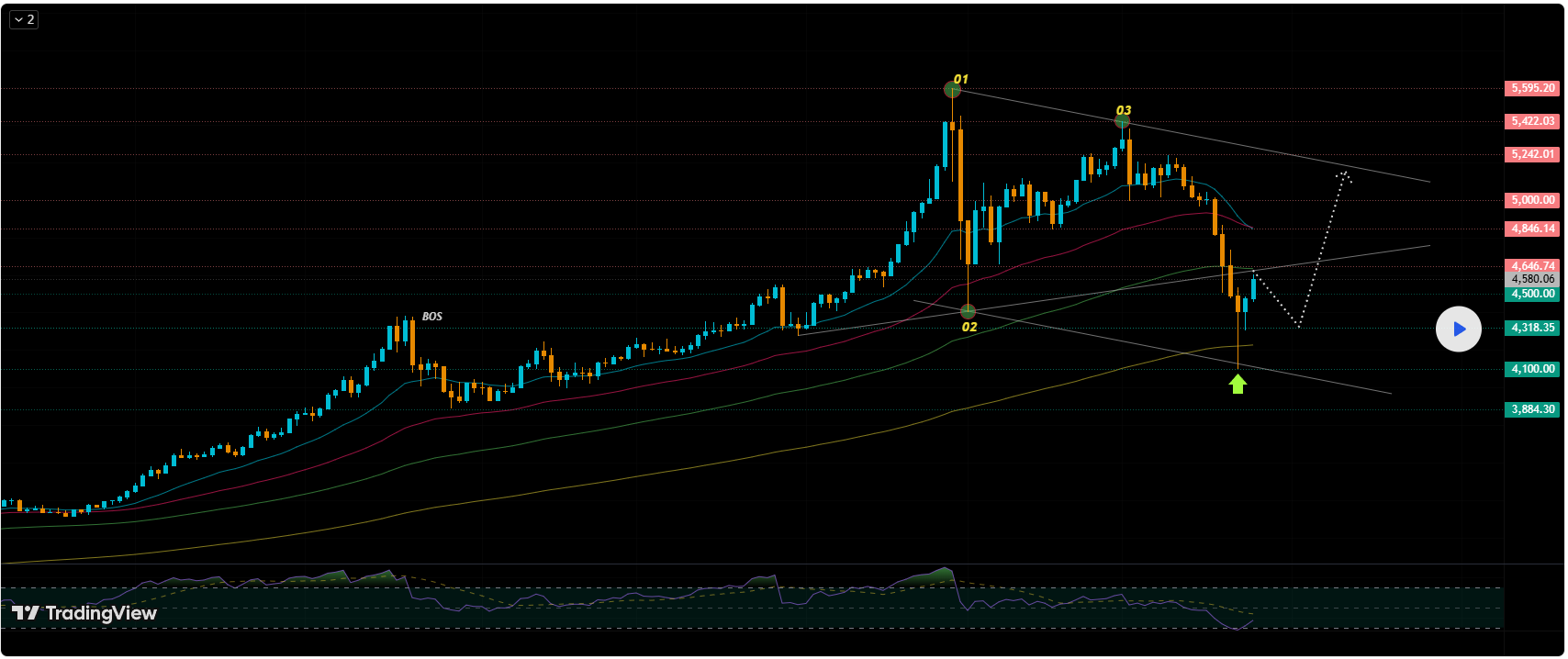 Hiện tại, giá đang trong pha hồi phục và tiến về vùng 4,600 - nơi hội tụ nhiều yếu tố kháng cự như vùng cung trước đó và các đường trung bình. Nếu không có sự gia tăng về động lượng, khả năng cao đây chỉ là một nhịp hồi kỹ thuật trong xu hướng điều chỉnh.