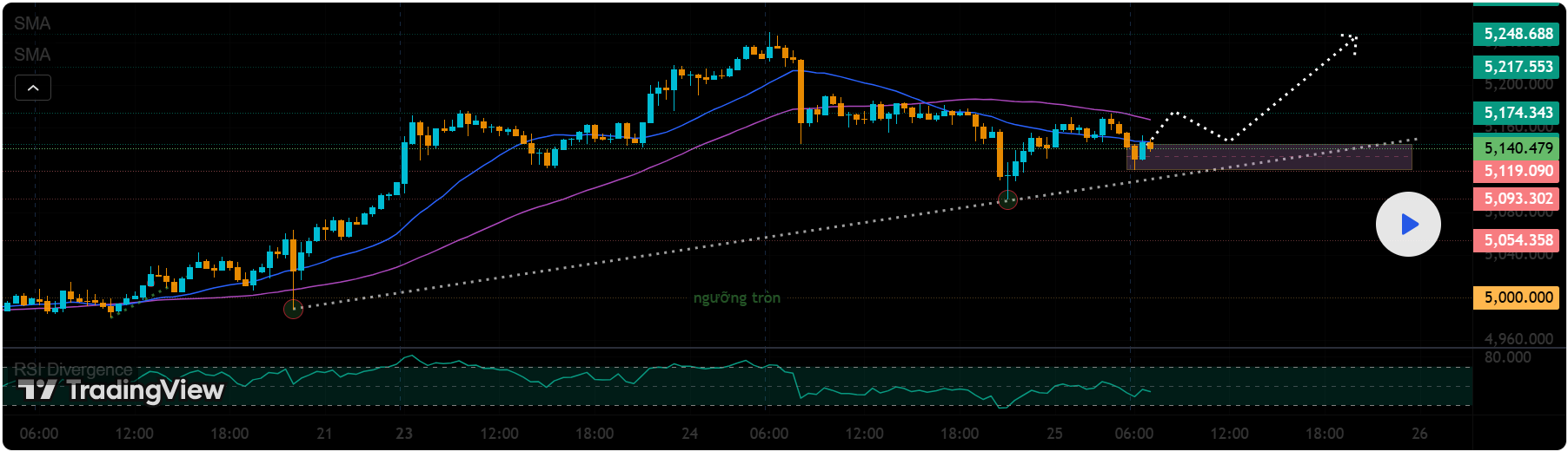 - Giá chạm hỗ trợ 5119 - 5093 - 5054 (bật lại kèm nến M5 xác nhận)