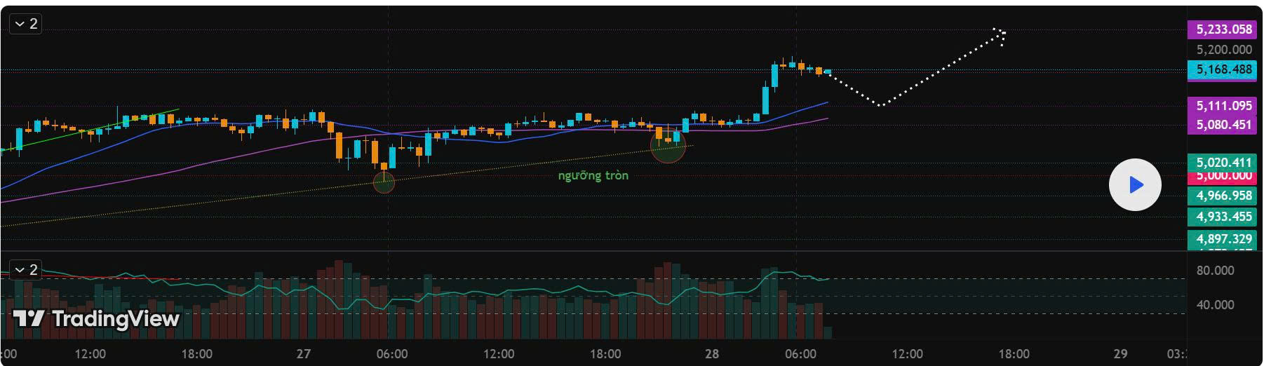 - Giá chạm kháng cự 5.080 - 5.123 - 5.164 (bật lại kèm nến M5 xác nhận)