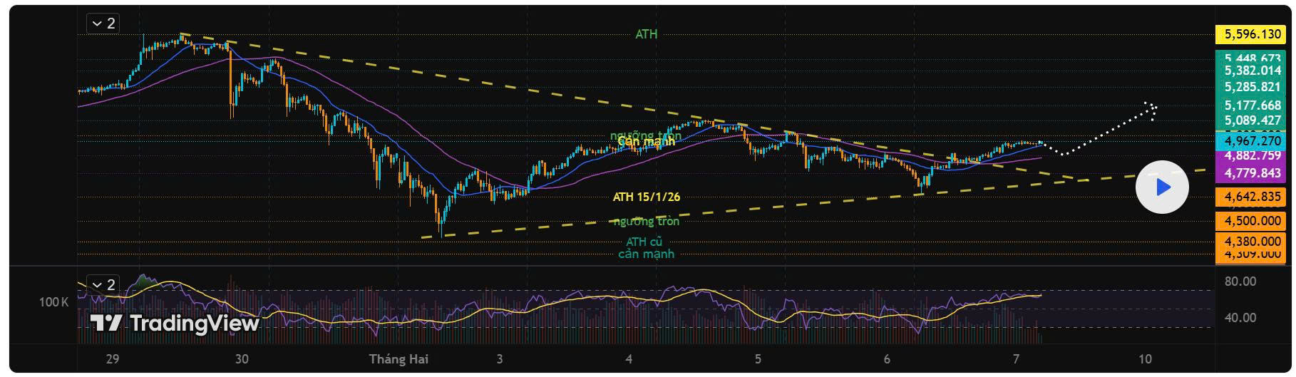 Cấu trúc giá hiện tại: Vàng đang thoát dần khỏi kênh giảm, hình thành higher low rõ ràng. Giá nằm trên MA ngắn hạn, MA trung hạn bắt đầu hướng lên → xu hướng ngắn hạn nghiêng về tăng. RSI đang tiệm cận vùng 60 – 65, cho thấy động lượng tăng có nhưng không quá nóng, dễ có nhịp rung lắc trước khi đi tiếp.